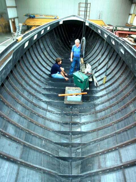 into the metal, something we became quite expert at as we drilled and tapped hundreds of holes for the mounting bolts! At last this phase of the build was over and it was time to move the hull to the painters shed. It was quite a day when we loaded her onto a truck and drove north to Makkum.