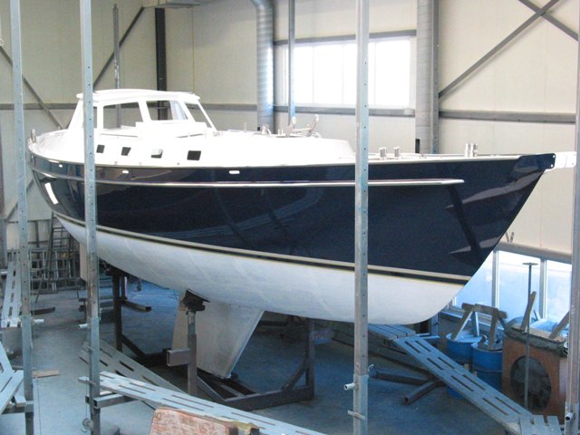 She was put into a warm, dry shed and over the next few months went through a metamorphosis, changing shades as the team of painters blasted, primed, faired and prepared her for the finish coats of Flag Blue and White, using an Awl Grip paint system.