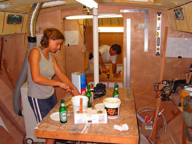 Once fitted by the carpenters, we screwed, glued and epoxied it all together, often working long into the night to be ready for the next day.