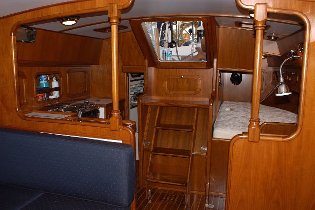Having designed the whole interior ourselves, we worked out the positions of seats, bunks, cupboards etc and helped make the patterns from which the teak veneered marine plywood was cut.